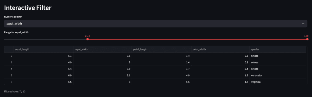 • The range slider + Boolean mask combo is one of the most versatile UI patterns in Streamlit.