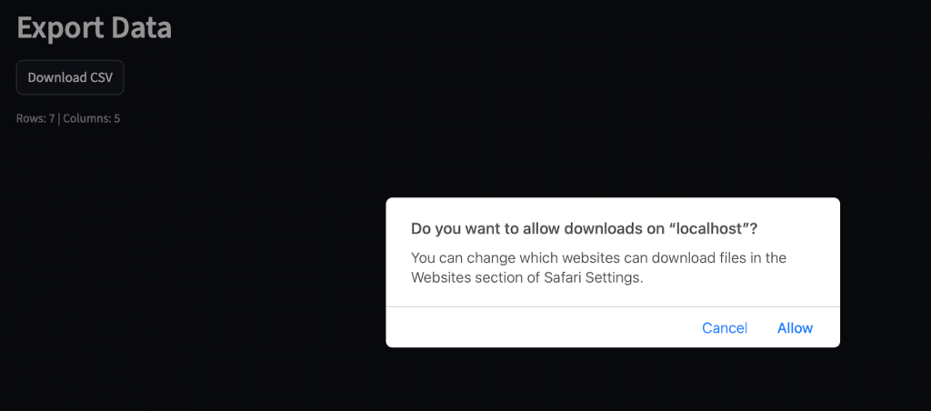 Figure 15: Screenshot of the Export page showing an active “Download CSV” button, and a caption below displaying “Rows: 7 | Columns: 5” (source: image by the author)