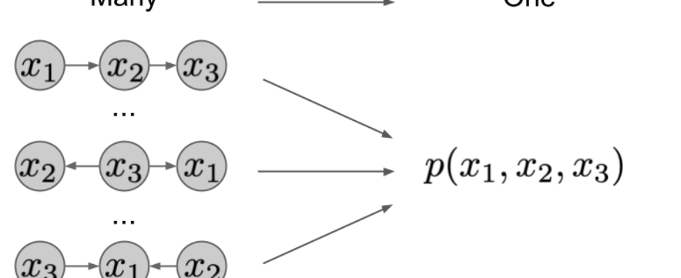 If you have a bunch of random variables – let’s call them $X_1, X_2, dots, X_n$ -, their joint distribution is $p left(X_1, X_2, dots, X_n right) $. If you invoke the chain rule of probability, you will have several options to express this joint as a product of factors: