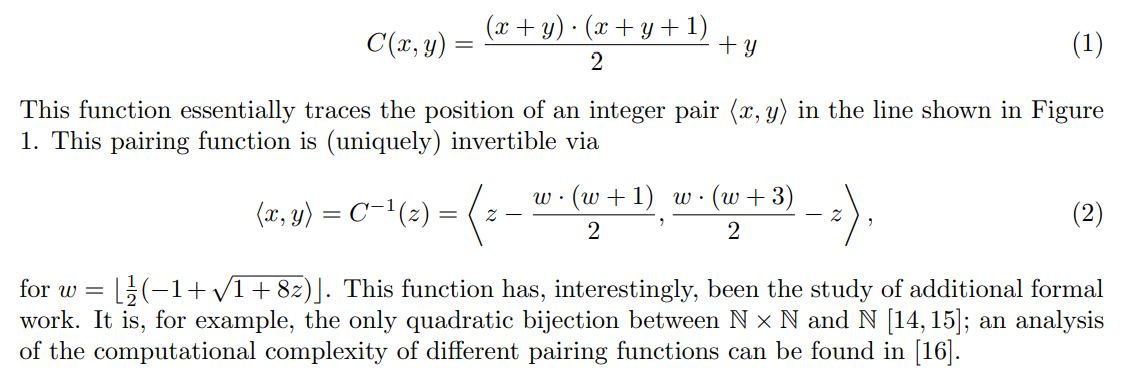 Other pairing functions are more convenient for some applications. A popular alternative, illustrated in Figure 1 is the Rosenberg-Strong pairing function [17],