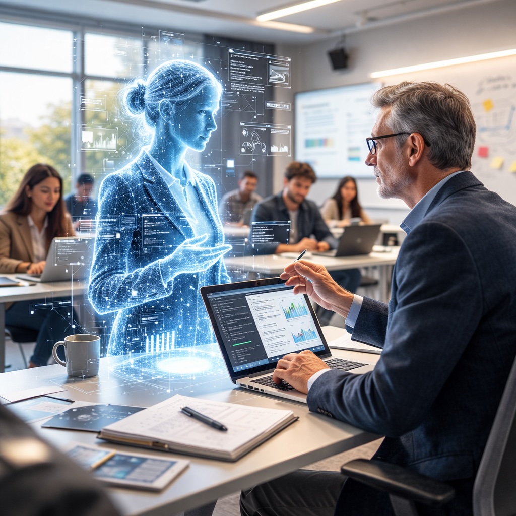 IMAGE: A hyper-realistic scene of a professor in a modern classroom interacting with a luminous AI hologram while students observe, symbolizing the integration of artificial intelligence into everyday academic life