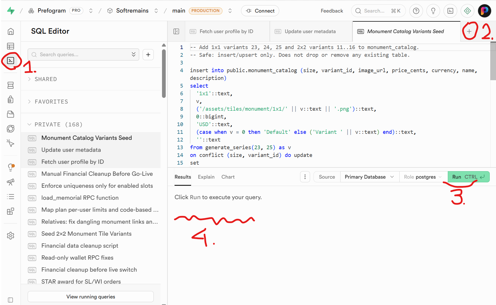 When a migration file is ready copy its contents, paste into Supabase SQL editor (1) and click Run (3):