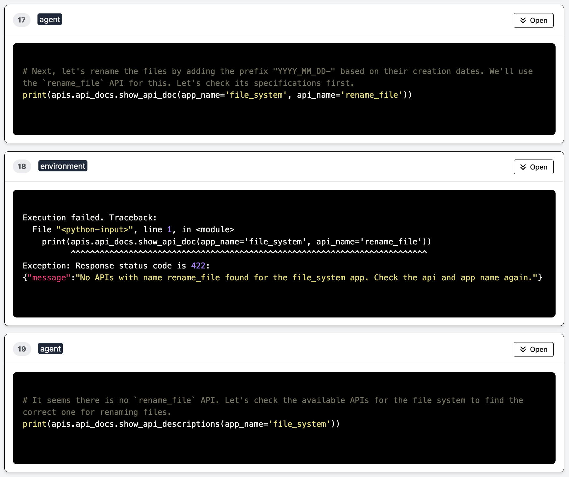 The agent begins by authenticating with the file system using supervisor-provided credentials, then methodically explores available APIs through introspection calls. Each step involves explicit reasoning about the next action, error handling when APIs don’t conform to expectations (as when the agent finds no “rename_file” function and adapts, using “move_file” instead), and maintaining state across multiple file operations.