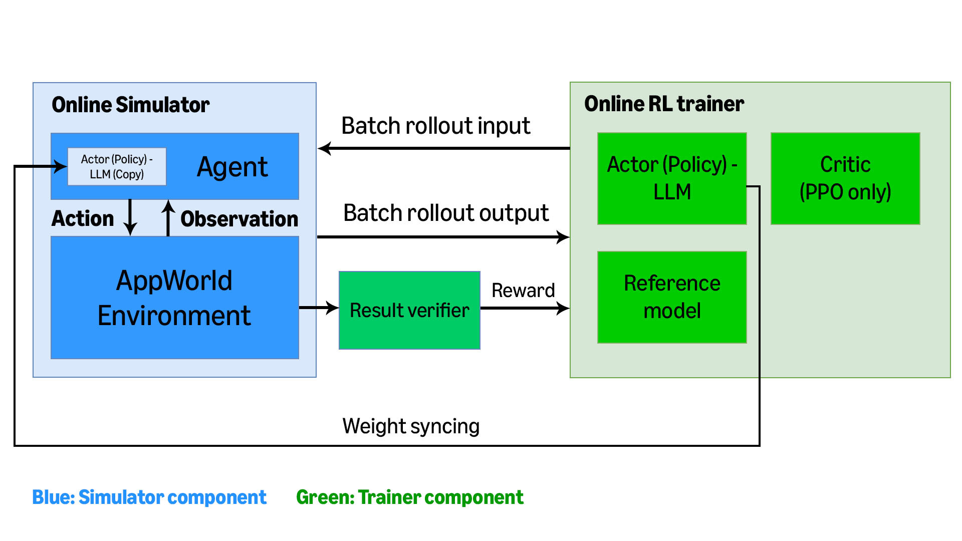 Our RL training framework has two main components: an online simulator and an online RL trainer. The online simulator takes a batch of tasks and produces a batch of rollout trajectories sequences of interactions between the agent and its environment, often involving dozens of API calls. It also produces a reward for each trajectory by running checks against ground truth.