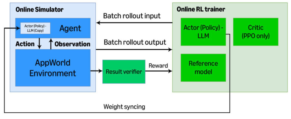 Our RL training framework has two main components: an online simulator and an online RL trainer. The online simulator takes a batch of tasks and produces a batch of rollout trajectories sequences of interactions between the agent and its environment, often involving dozens of API calls. It also produces a reward for each trajectory by running checks against ground truth.