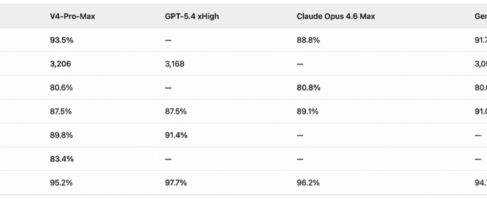 Here’s what V4-Pro-Max (maximum reasoning effort) scores against the best in the world: