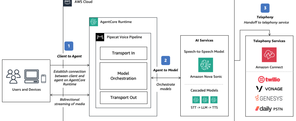 Deploying intelligent voice agents that maintain natural, human-like conversations requires streaming to users where they are, across web, mobile, and phone channels, even under heavy traffic and unreliable network conditions. Even small delays can break the conversational flow, causing users to perceive the agent as unresponsive or unreliable. For use cases such as customer support, virtual assistants and outbound campaigns, a natural flow is critical for user experience. In this series of posts, you will learn how streaming architectures help address these challenges using Pipecat voice agents on Amazon Bedrock AgentCore Runtime.