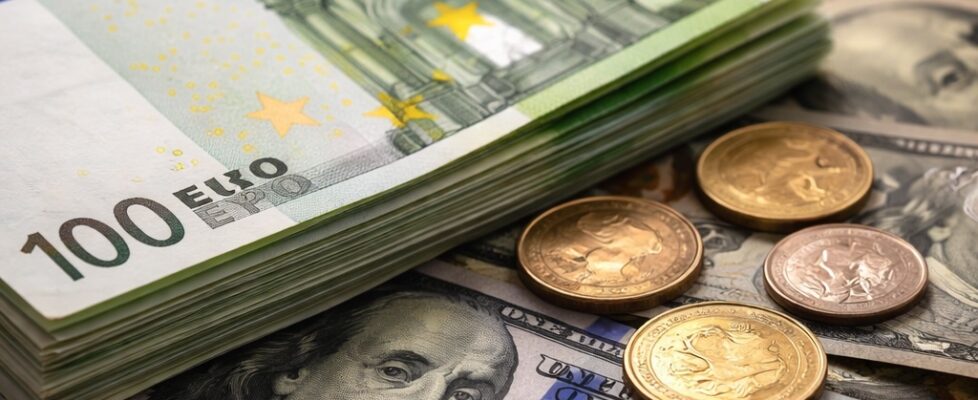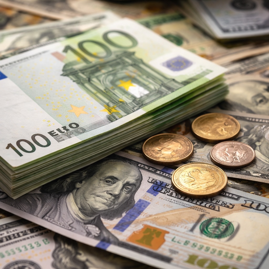 IMAGE: A close-up of stacked euro banknotes and scattered euro and US dollar coins resting on US dollar bills, symbolizing the persistence of physical cash in modern economies