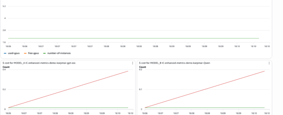 - View how much each model costs. With multiple models sharing the same infrastructure, calculating the true cost per model can be complex. With enhanced metrics, we can now calculate and associate cost per model by tracking GPU allocation at the inference component level.