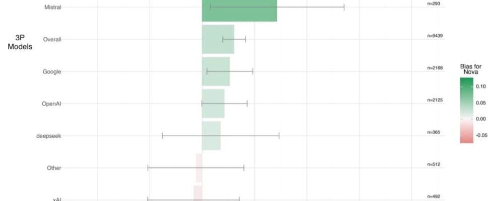 In the following figure, you can see how the Nova LLM-as-a-Judge bias compares to human preferences when evaluating Amazon Nova outputs compared to outputs from other models. Here, bias is measured as the difference between the judge’s preference and human preference across thousands of examples. A positive value indicates the judge slightly favors Amazon Nova models, and a negative value indicates the opposite. To quantify the reliability of these estimates, 95% confidence intervals were computed using the standard error for the difference of proportions, assuming independent binomial distributions.