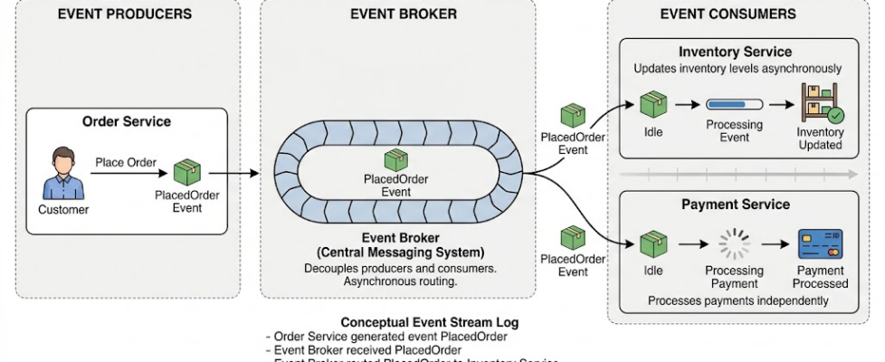 Consider a practical example: an e-commerce platform processing orders. When a customer places an order, the Order Service doesn’t call Inventory, Shipping, or Billing synchronously. Instead, it emits an OrderPlaced event to an event bus. Inventory Service listens for that event and decrements stock asynchronously; Shipping Service schedules delivery; Billing Service initiates payment. None of these services need to know about each other’s presence or state — they only respond to relevant events.