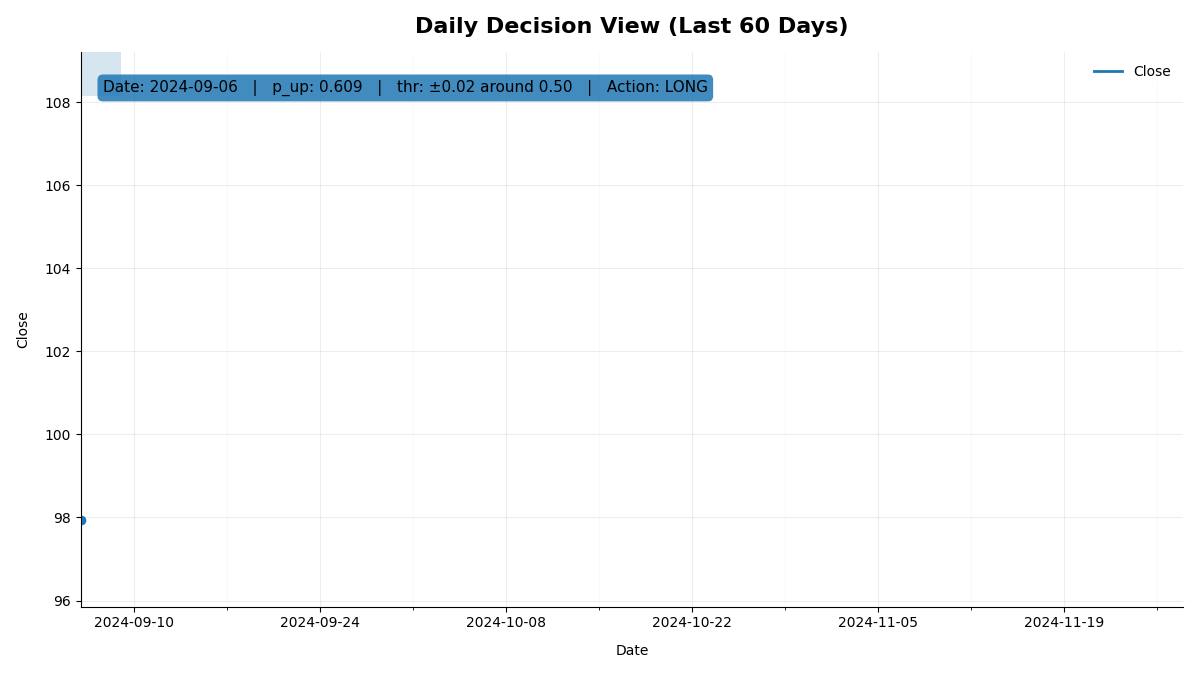 A practical daily routine: update features, predict today, apply the threshold rule, and produce a readable decision report