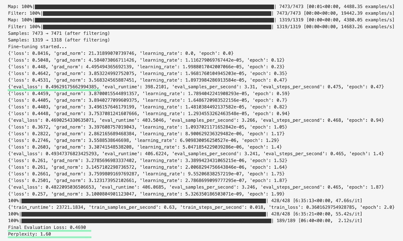 As your model trains, keep an eye on the evaluation loss. If it increases while training loss drops, the model is overfitting. In that case, adjust epochs, lower the learning rate, modify weight decay, and other hyperparameters. In the example below, we see healthy results with eval loss decreasing from 0.496 to 0.469 and a final perplexity of 1.60.