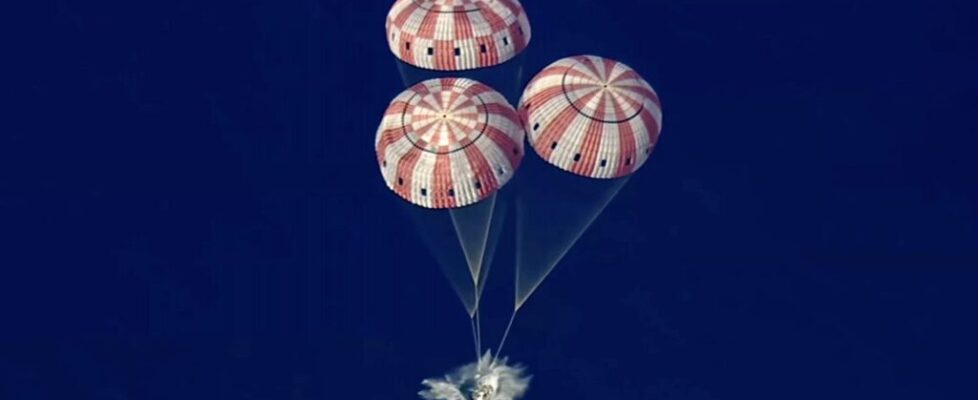 Airborne tracking planes beamed live video of Orion’s descent back to Mission Control, showing the capsule jettison its parachute cover and deploy a series of chutes to stabilize its plunge toward the Pacific. Then, three larger main chutes, each with an area of 10,500 square feet, opened to slow Orion for splashdown at 8:07 pm EDT Friday (00:07 UTC Saturday).