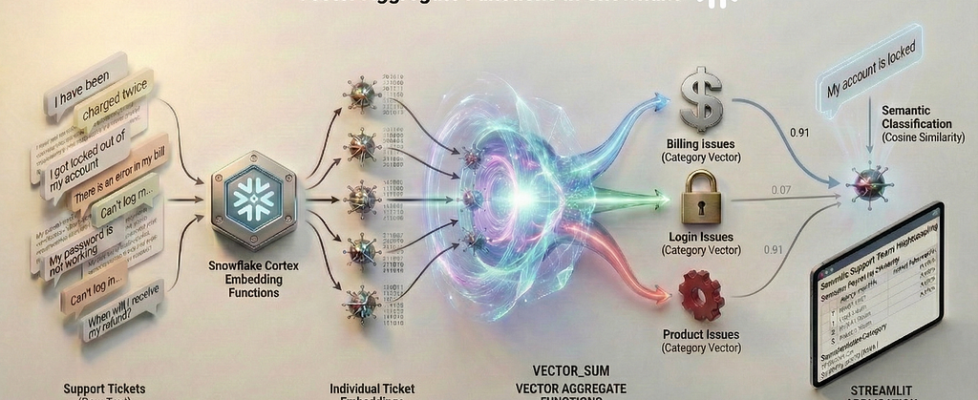 With the recent introduction of vector aggregate functions in Snowflake, embeddings are no longer just intermediate artifacts but become truly composable building blocks for analytics and AI. By making embeddings and vectors first-class citizens of the data platform, through native VECTOR support, Snowflake Cortex embedding functions, and vector aggregate functions (VECTOR_SUM, VECTOR_AVG, VECTOR_MIN, and VECTOR_MAX), semantic intelligence can now be built directly in SQL, without external pipelines, vector databases, or custom ML infrastructure.