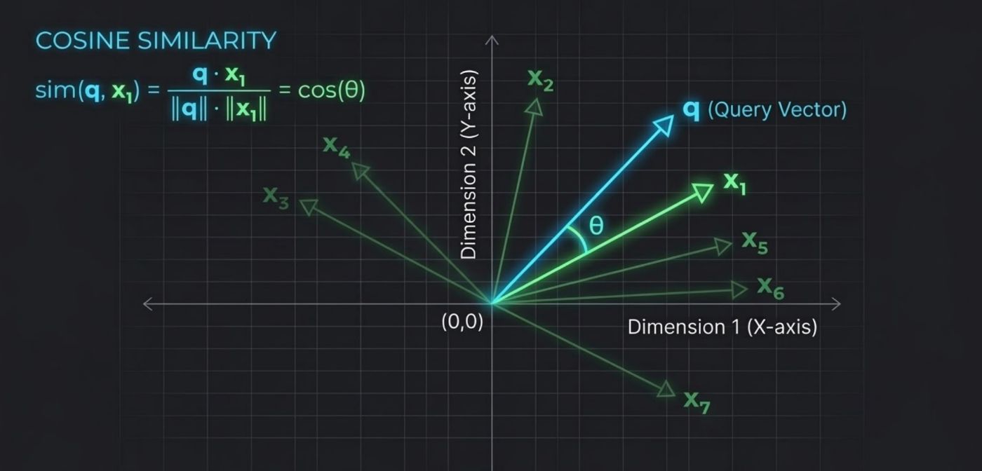 For cosine similarity: sim(**q**, **x**_i) = (**q** · **x**_i) / (‖**q**‖ · ‖**x**_i‖)