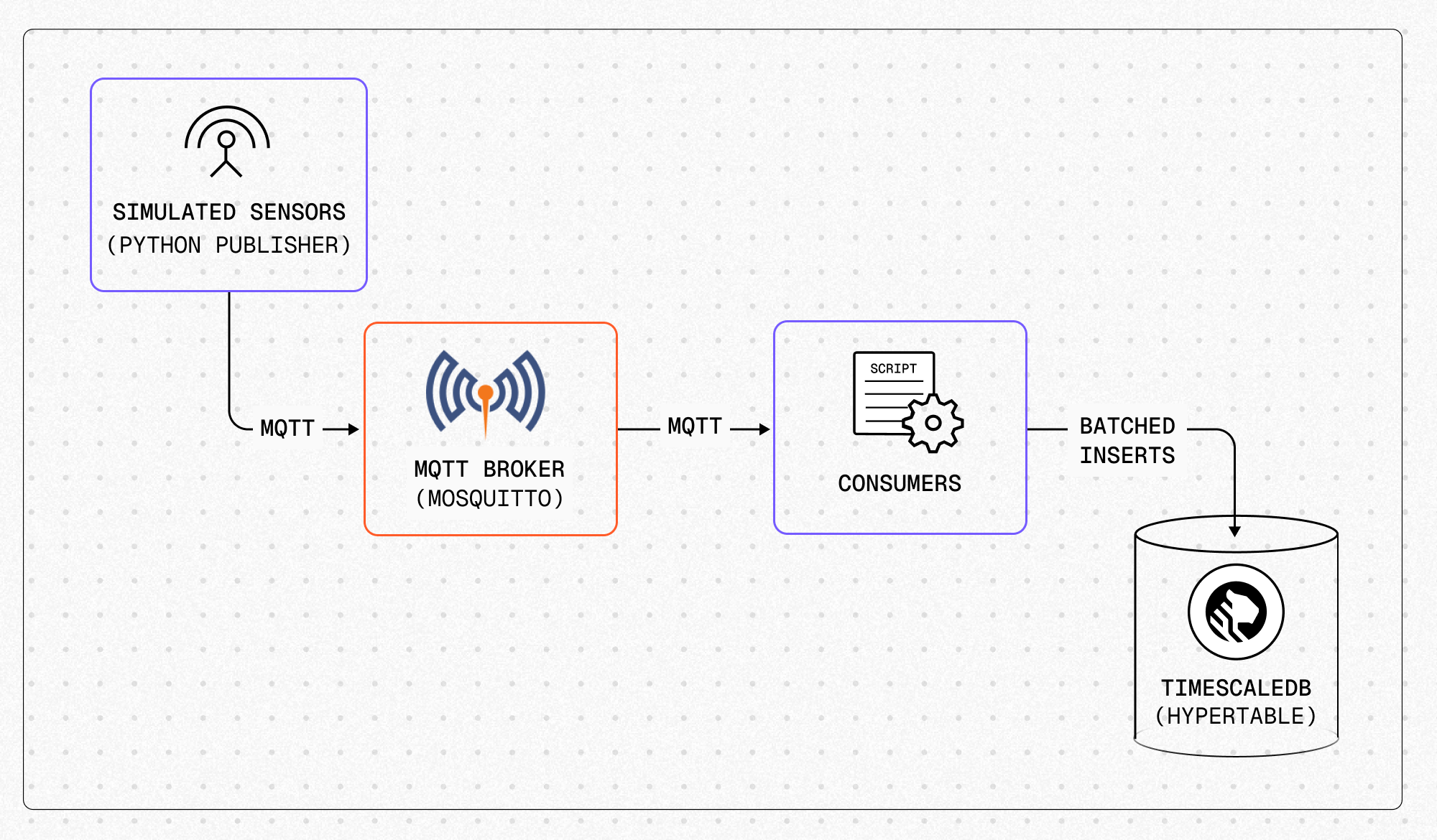 This article walks you through the fundamentals of building an MQTT-to-TimescaleDB pipeline: why the per-message insert approach fails under load, the schema foundations that enable batched writes, how to implement time-window batching that keeps pace with your sensors, and how to handle common edge cases like graceful shutdown, duplicates, malformed messages, and back-pressure. The focus is on the ingestion pipeline (ensuring sensor data reliably reaches TimescaleDB at scale). For schema design and data exploration, see Building a Data Pipeline. For query optimization techniques (indexing, continuous aggregates, compression tuning), see Optimizing for High-Volume Production Data.