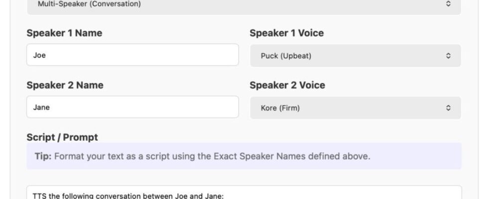 ![Screenshot of a "Gemini 3.1 Flash TTS" web application interface. At the top is an "API Key" field with a masked password. Below is a "TTS Mode" section with a dropdown set to "Multi-Speaker (Conversation)". "Speaker 1 Name" is set to "Joe" with "Speaker 1 Voice" set to "Puck (Upbeat)". "Speaker 2 Name" is set to "Jane" with "Speaker 2 Voice" set to "Kore (Firm)". Under "Script / Prompt" is a tip reading "Tip: Format your text as a script using the Exact Speaker Names defined above." The script text area contains "TTS the following conversation between Joe and Jane:nnJoe: How's it going today Jane?nJane: [yawn] Not too bad, how about you?" A blue "Generate Audio" button is below. At the bottom is a "Success!" message with an audio player showing 00:00 / 00:06 and a "Download WAV" link.](https://static.simonwillison.net/static/2026/gemini-flash-tts.jpg)