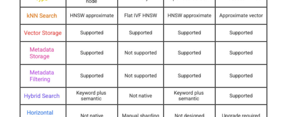 • Amazon OpenSearch vector Search — Amazon OpenSearch Service adds vector search capabilities to the managed OpenSearch platform. It provides scalable clusters, automated backups, and HA with AWS SLAs. OpenSearch supports approximate vector search alongside traditional inverted index search for hybrid workflows. Being part of AWS gives deep integrations with the ecosystem (IAM, CloudWatch, S3). As a managed service it eases operations but involves cost and vendor coupling.
