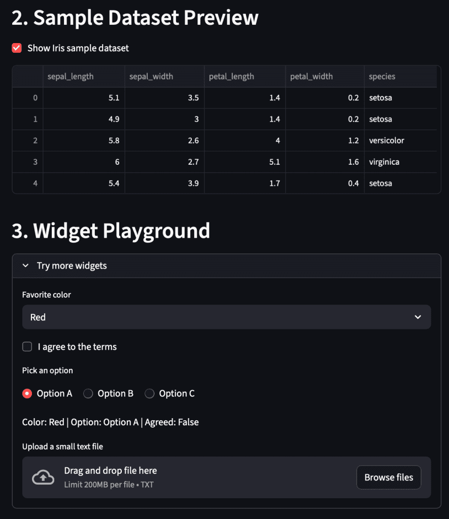 st.file_uploaderlets you upload small text files. Once uploaded, the app reads the contents, decodes them, and displays the first 500 characters.
