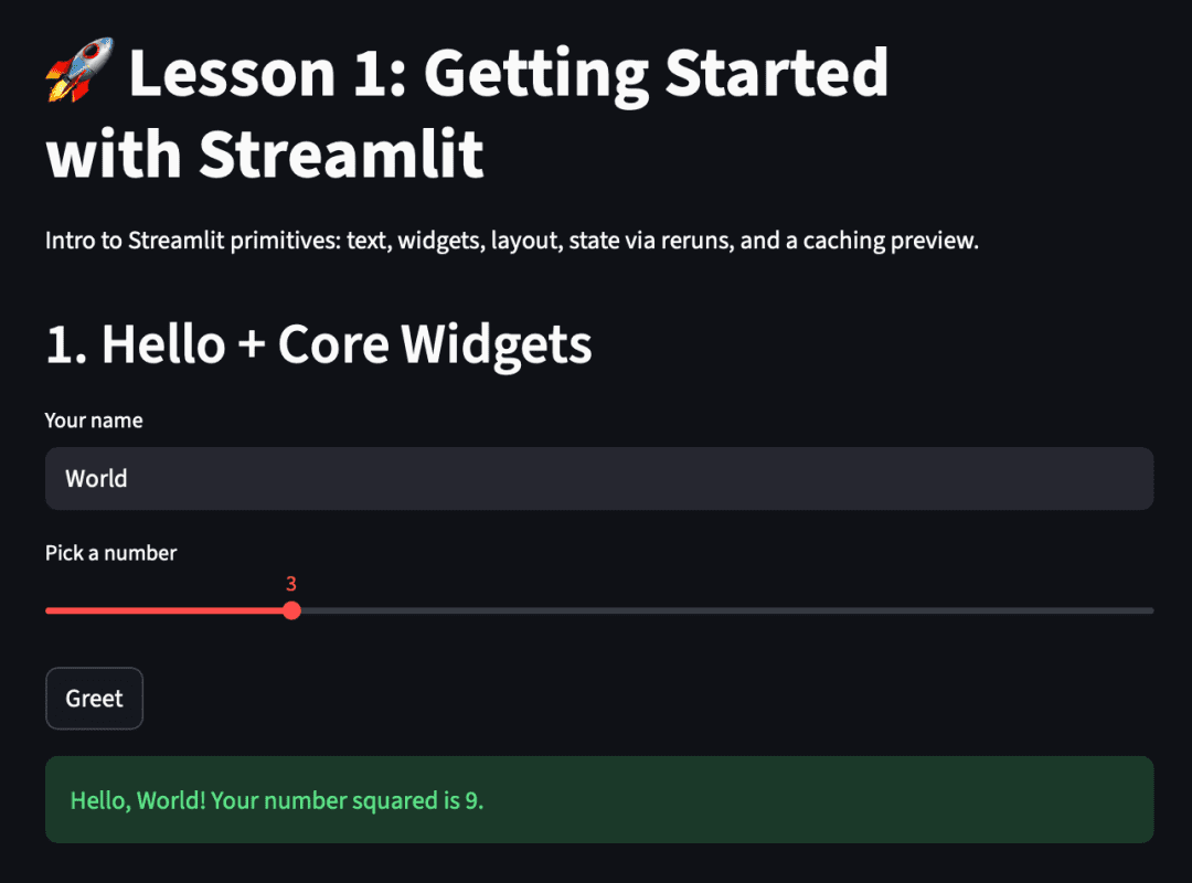 lesson1_main.py) runs once, line by line. Every Streamlit command (e.g.,st.title(),st.slider(), orst.write()) adds a new element to an internal “page plan” that defines what your app looks like. - Widget State Tracking: Streamlit automatically keeps track of widget values (e.g., which number is selected on a slider or what text is typed in a box). Each browser session gets its own state.