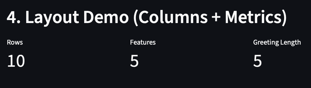 Widgets and text added inside each context appear side-by-side rather than stacked vertically.st.metric(label, value): displays a clean, compact key-value card often used for key performance indicators (e.g., totals, averages, growth rates).