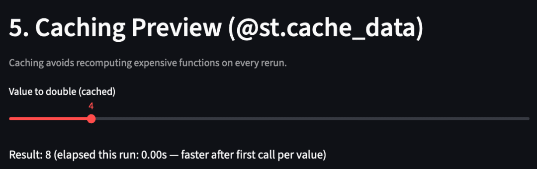 val = st.slider("Value to double (cached)", 1, 20, 4, key="cache_slider")