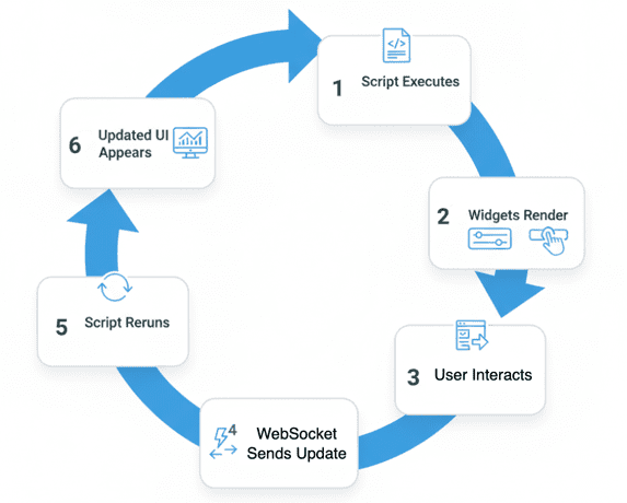 - Rerun Trigger: The backend re-executes your Python script from the top, using the new widget state. Importantly, your script isn’t a persistent loop — it’s a function of the current inputs.