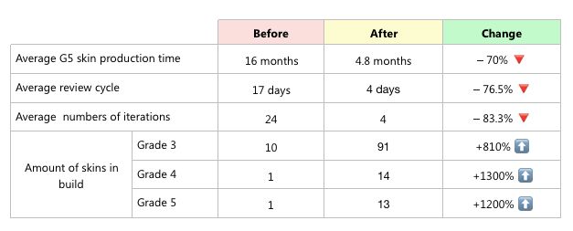 First, I analyzed the previous experience and the current production pace of meshes (characters and a skin). Using data from Jira and tons of Excel sheets, we identified several weak points.