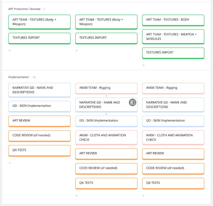 There was no structured roadmap for character art production in general and cosmetics in particular. Meshes were considered part of the character development pipeline, and all work related to them was placed into three large stages — L0, L1, L2 — from prototype to final polished version. Each of these oversized tasks could exceed the sprint length not just by two cycles, but sometimes by three or even four.