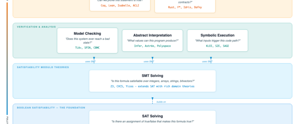 Hierarchical diagram showing automated reasoning sub-fields organized by abstraction level, from Boolean satisfiability at the base to theorem proving and type systems at the top.
