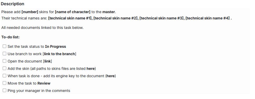 I’ve already described how we restructured Epics and art tasks (linkhere). We now needed the same clarity for departments involved only intermittently. Tasks had to be readable at a glance. I wrote them as if a child might read them—everything had to be obvious without additional explanation. A Game Design task looked like this: