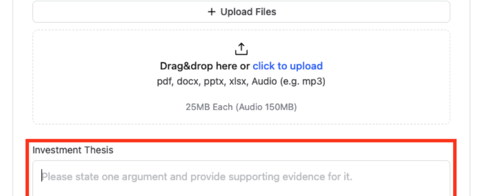 Investors upload research such as broker reports, expert calls, and public filings in the Upload Files field, as shown in the following screenshot. The system parses, chunks, and indexes this content into a structured evidence repository.