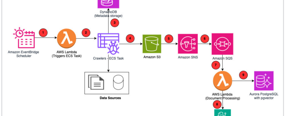 - Crawlers – AWS Lambda invokes crawlers that are executed as tasks by Amazon Elastic Container Service (Amazon ECS).