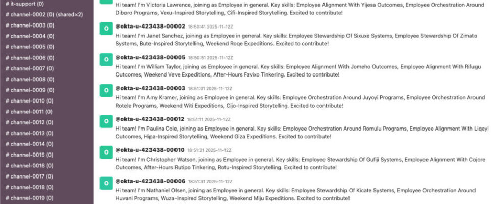 This screenshot of their Slack twin also helps illustrate how the testing process works, showing a stream of simulated Okta users who are about to need access to different simulated systems.
