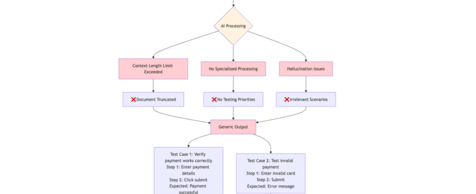 The single-agent approach presented several critical limitations. Context length restrictions prevented processing large documents effectively, but the lack of specialized processing phases meant the AI couldn’t understand testing priorities or risk-based approaches. Additionally, hallucination issues created irrelevant test scenarios that could mislead QA efforts. The root cause was clear: AI attempted to compress complex business logic without the iterative thinking process that experienced testers employ when analyzing requirements.
