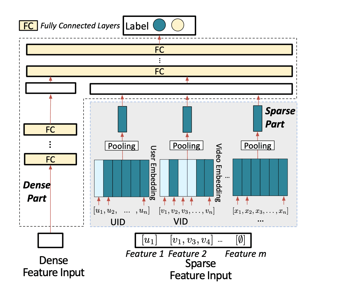 Model parallelism: Following approaches from Kuaishou’s research, sparse embeddings can be sharded across multiple servers while dense embeddings are replicated. This distributes the memory and compute burden.