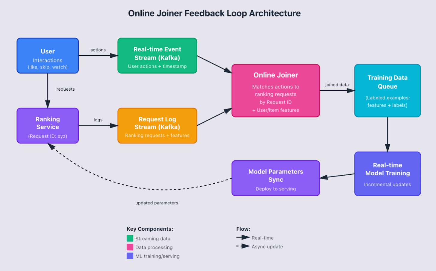 But capturing the events is just the first step. You need to join these engagement signals with the original ranking request that generated the recommendations. This is where the “online joiner” comes in – a system that matches user actions to the specific recommendation query that surfaced the content, along with all the relevant user and item features at that moment in time.