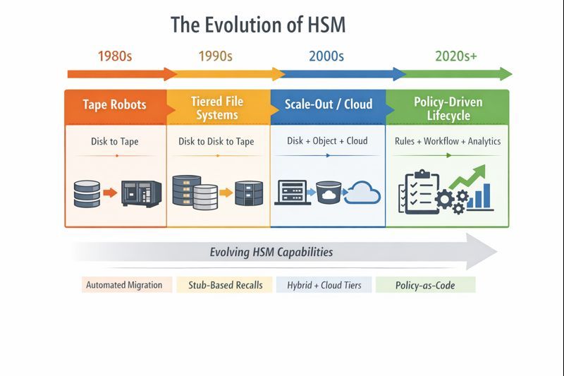 Old HSM did that with stubs and tape robots. n Modern HSM does it with lifecycle rules, object metadata, and restore workflows.