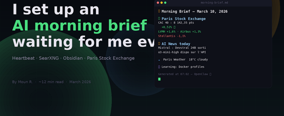 It checked the Paris Stock Exchange. It scanned overnight AI model releases. It fetched the weather. And it summarized everything in a timestamped Markdown file in my Obsidian vault, ready to read in 90 seconds.