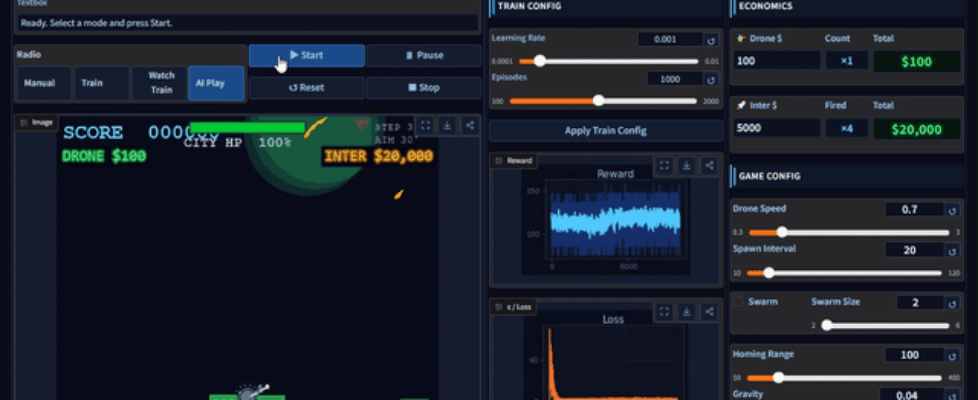 The -0.5 firing penalty forces the agent to learn ammo conservation. What emerged: under low swarm density it fires aggressively, under high density it becomes selective. Past a certain swarm threshold it fails regardless — which is honestly the most interesting finding. Trains in ~2 minutes on CPU. 150 episodes, epsilon-greedy, target network updated every 10 episodes. Curious what reward shaping others have tried for similar problems. submitted by /u/AfraidRub1863 |
