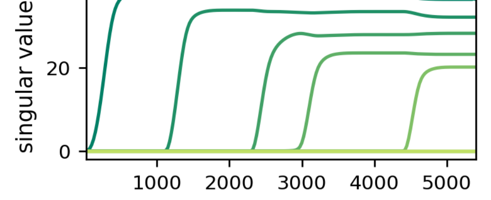 When initializing near the origin (as commonly done in practice), we therefore expect singular values to progress slowly at first, and then, upon reaching a certain threshold, to quickly rise until convergence.