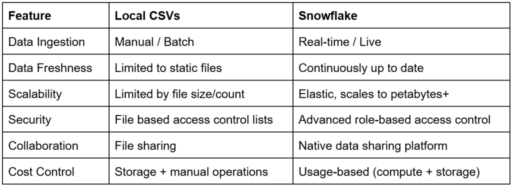 This comparison highlights why local CSV workflows break down at scale. Snowflake replaces manual file handling with a governed, elastic, and real-time data platform that supports secure collaboration, fine-grained access control, and cost-efficient analytics.