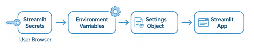 This section is the real heart of the configuration system. It ensures that even though the Settings object is frozen, all your credentials are loaded once — right when it’s created — and remain constant throughout the app’s lifecycle. Streamlit’s rerun model won’t reset or mutate these values, keeping your environment predictable and reducing accidental mutation.