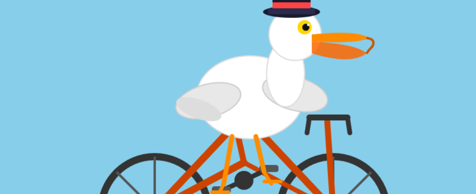 The pelican has a jaunty top hat with a red band. There is a string between the upper and lower beaks for some reason. The bicycle frame is warped in the wrong way.