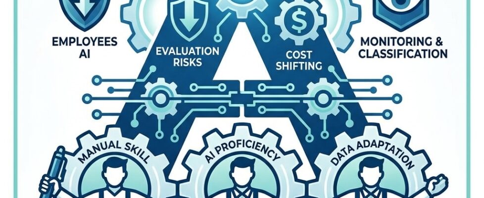 IMAGE: A blue and white infographic illustrating the article's concept of the 'Algorithmic Employability Trap'. A large capital 'A' is composed of interconnected gears and electronic circuits, symbolizing a system of control. Inside and around it are stylized icons and English text labels highlighting key negative impacts, such as 'Evaluation Risks', 'Cost Shifting', 'Monitoring & Classification', and showing employees as parts of a machine labeled 'AI Proficiency' and 'Data Adaptation'. A worker with a pen and 'Manual Skill' stands outside the main system. Text at the bottom describes the trend: 'FROM OPTIONAL TOOL TO MANDATORY REQUIREMENT: NEW DIGITAL OBEDIENCE & INEQUALITY IN THE WORKFORCE'