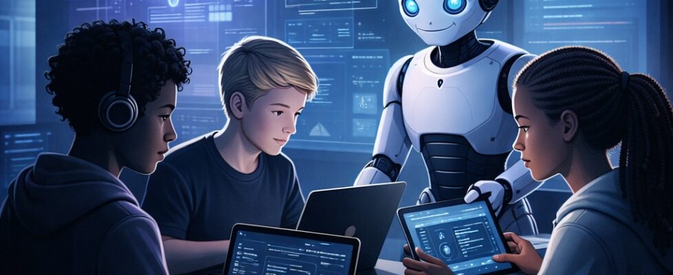 IMAGE: A sleek, editorial-style scene showing four teens working with laptops and tablets in a dim, futuristic classroom. A humanoid robot assists them as holographic data glows in cool blue tones, creating a minimalist, high-tech atmosphere