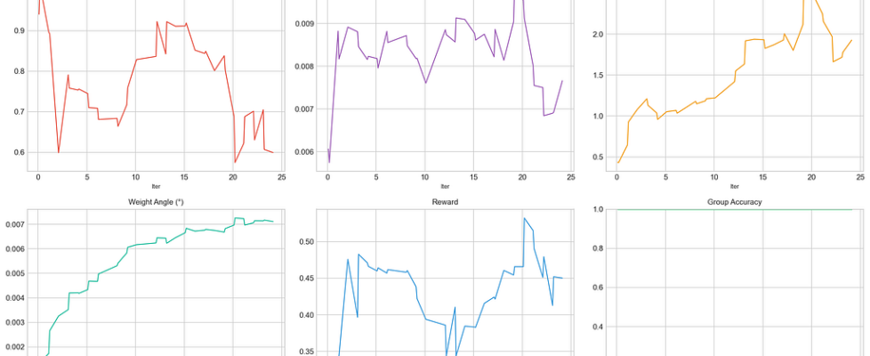 After 24 iterations (40 training groups, 120 total rollouts), the results at this early snapshot:
