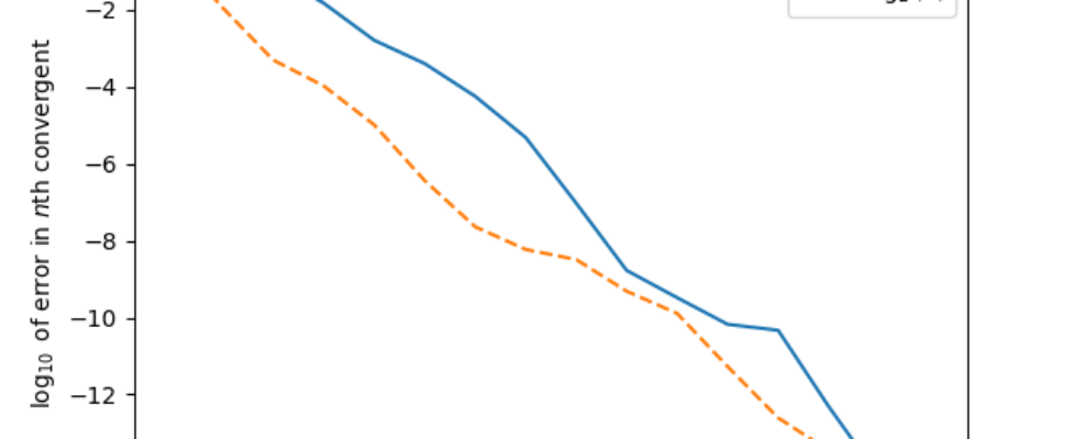 Here’s a more conventional comparison, plotting the log of approximation error against the log of the denominators.