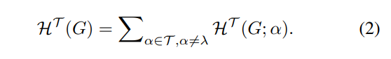 In the partitioning tree T with root node λ, each tree node α is associated with a subset of V, denoted as module Tα, and the immediate predecessor of it is written as α −. The module of the leaf node is a singleton of the graph node. The scalar gα is the total weights of graph edges with exactly one endpoint in module Tα. Then, the H-dimensional structural information of G by T is given as,